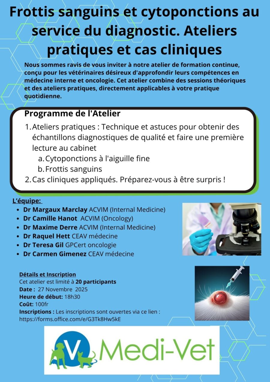 Nous sommes ravis de vous inviter à notre atelier de formation continue, conçu pour les vétérinaires désireux d’approfondir leurs compétences en médecine interne et oncologie. Cet atelier combine des sessions théoriques et des ateliers pratiques, directement applicables à votre pratique quotidienne.